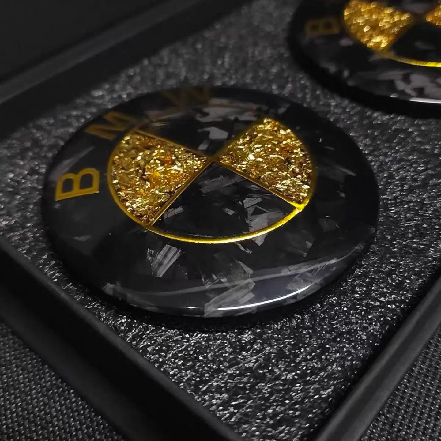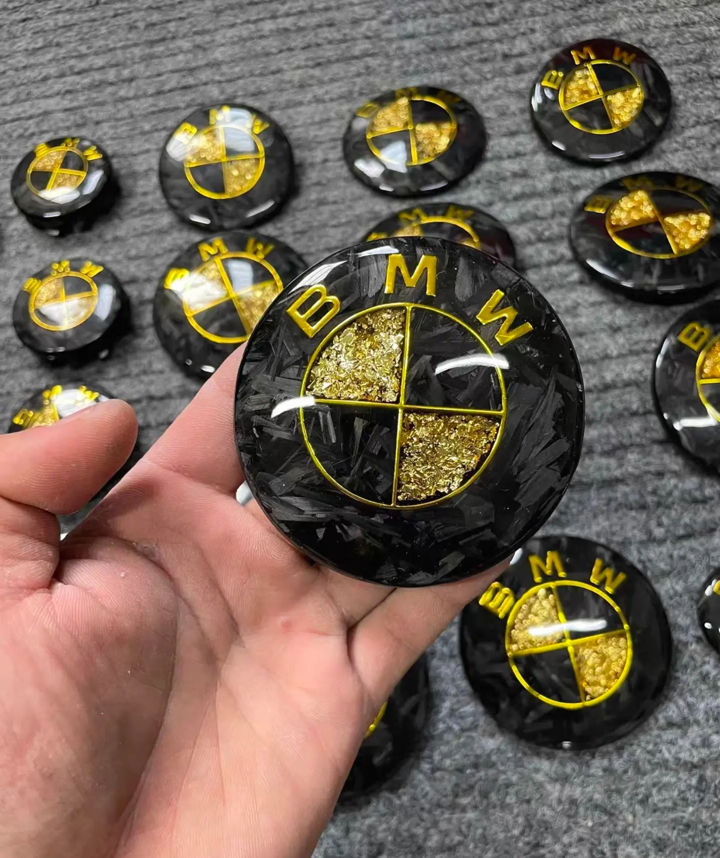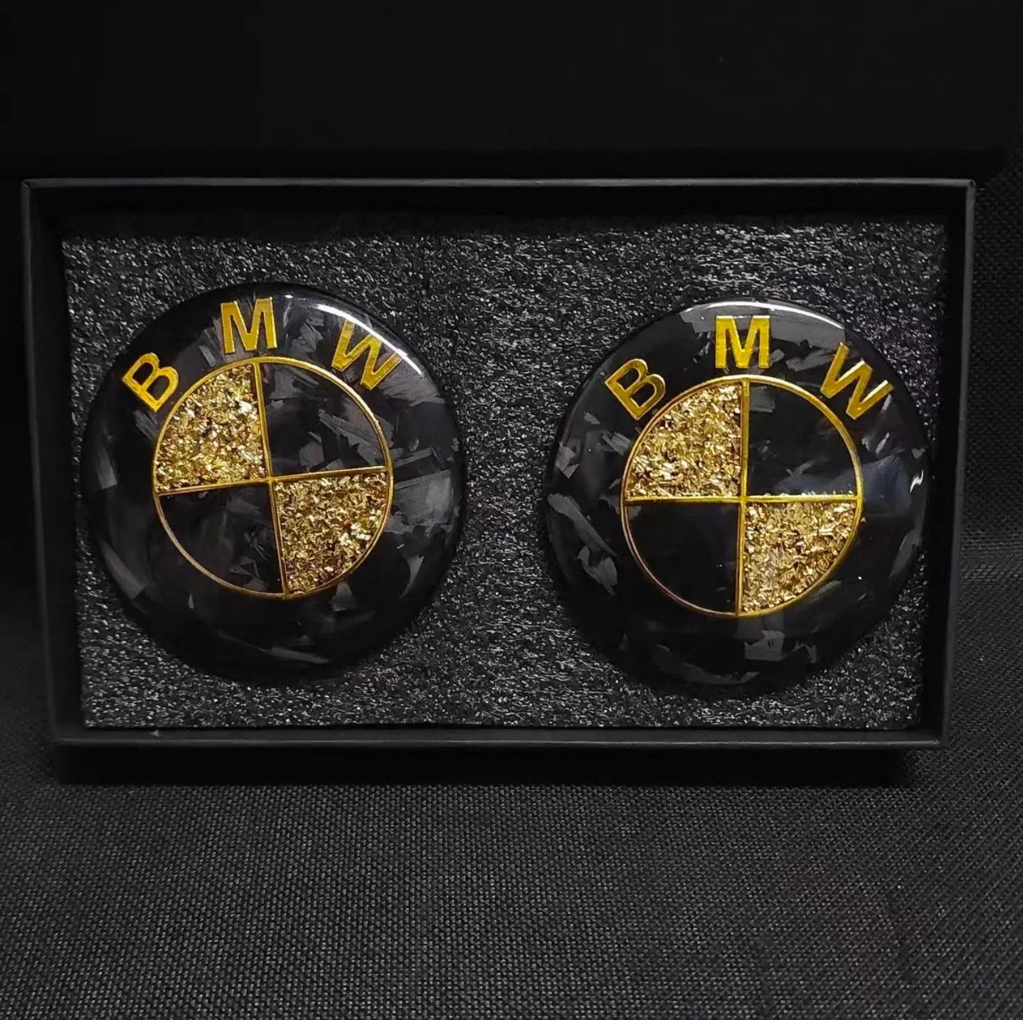Inspired by the racing soul of supercars. The unique texture of forged carbon fiber symbolizes speed and power, while the randomly distributed gold leaf adds a meteor-like sense of luxury. This is more than an emblem; it is a medal of identity for your vehicle